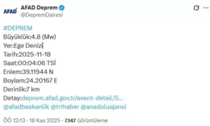 Ege Denizi’nde gece yarısı korkutan bir deprem meydana geldi. AFAD verilerine göre, saat 00.04’te kaydedilen 4.8 büyüklüğündeki deprem, başta Çanakkale olmak üzere İzmir, Manisa, Balıkesir ve Aydın’da da hissedildi.
