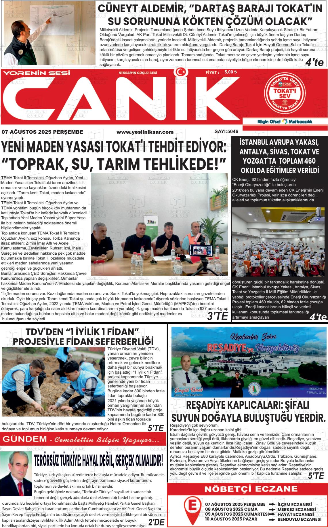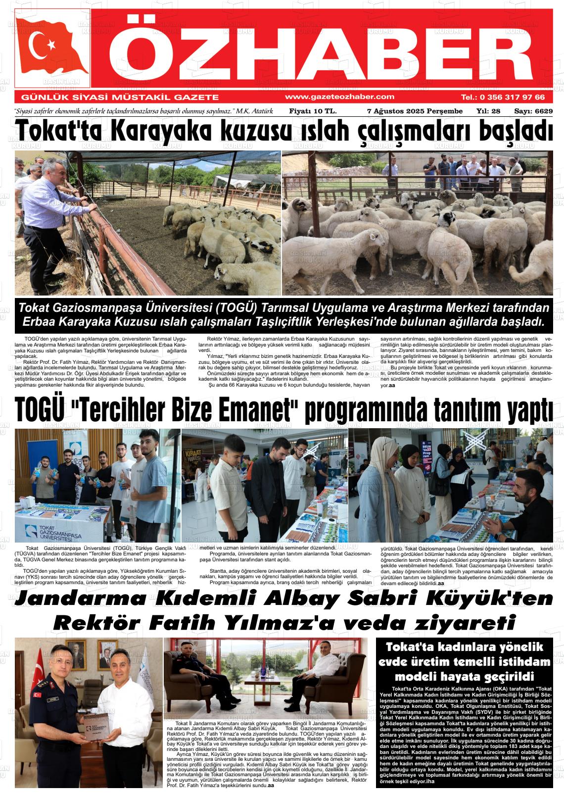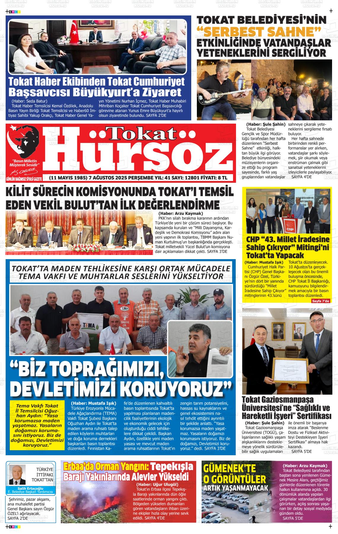 Tokat Yerel Gazeteleri 02 Ekim 2025, Perşembe Günü Manşeti